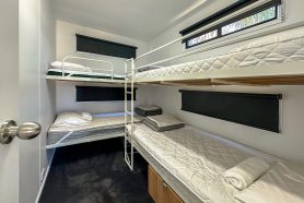 - Queen bed with a double bed and single bunk above, sleeping 5, all cabin linen provided