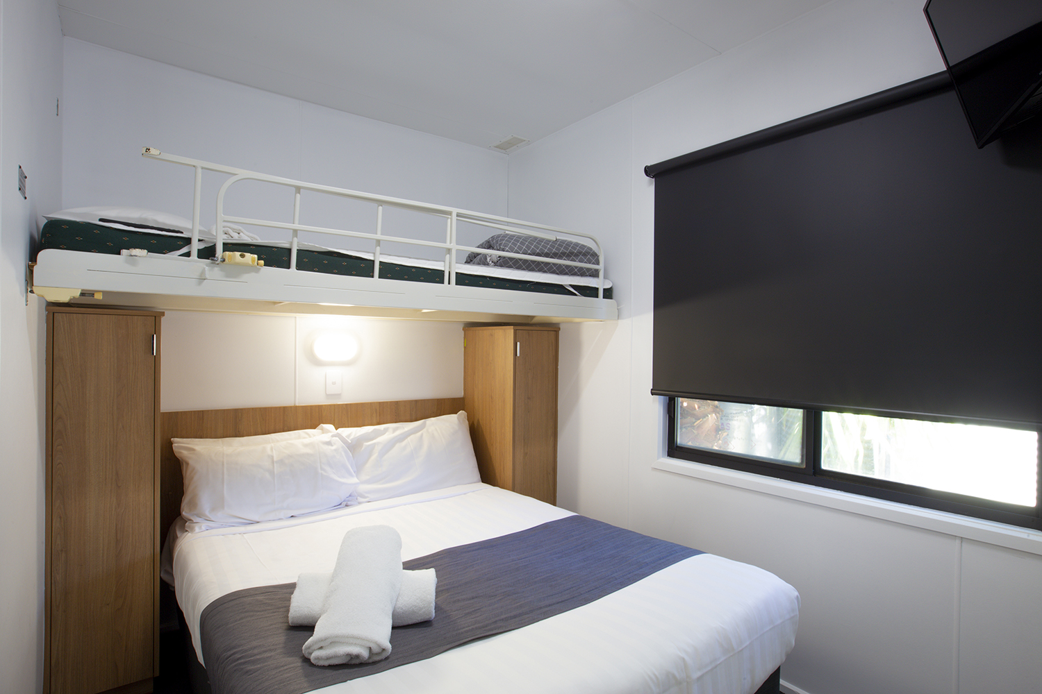 - Queen bed with a double bed and single bunk above, sleeping 5, all cabin linen provided